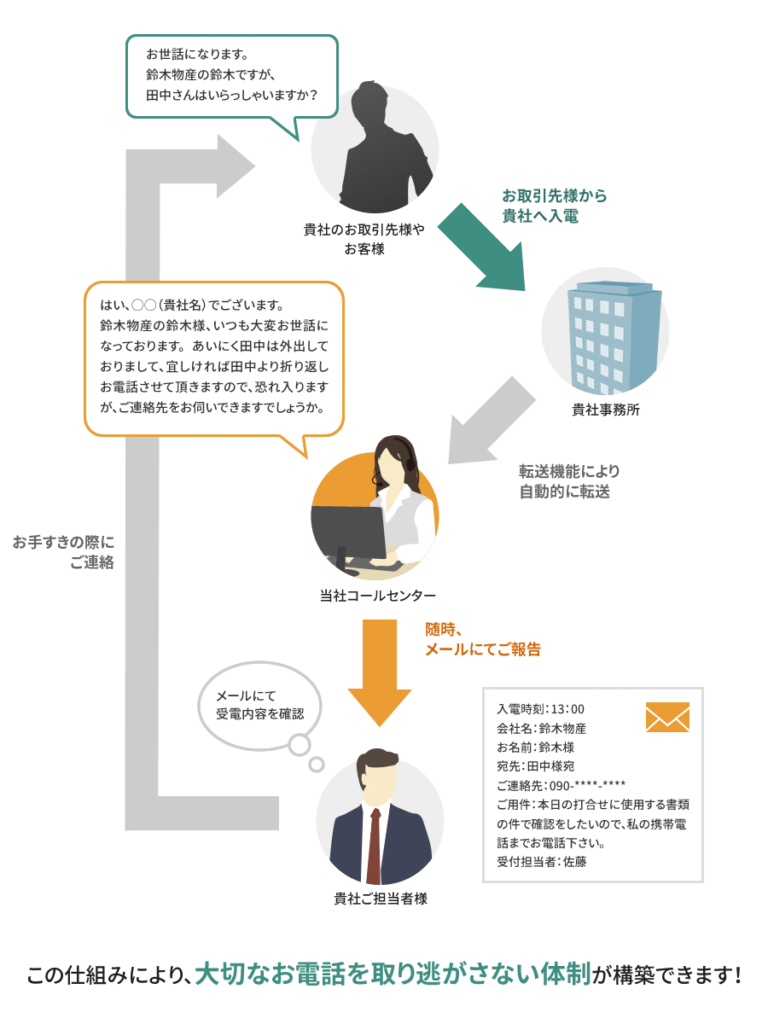 では、どの様にして貴社にかかるお取引先様やお客様からのお電話を、当社で受付対応できるのでしょうか。それは、貴社の代表電話番号の「転送機能」を利用して当社に「電話転送」をするからなのです。(転送機能についての詳しい説明はこちらから)そして、貴社宛のお電話は「電話転送」により当社に着信し、当社のオペレーターが有能な「秘書」として受付対応を行うのです。